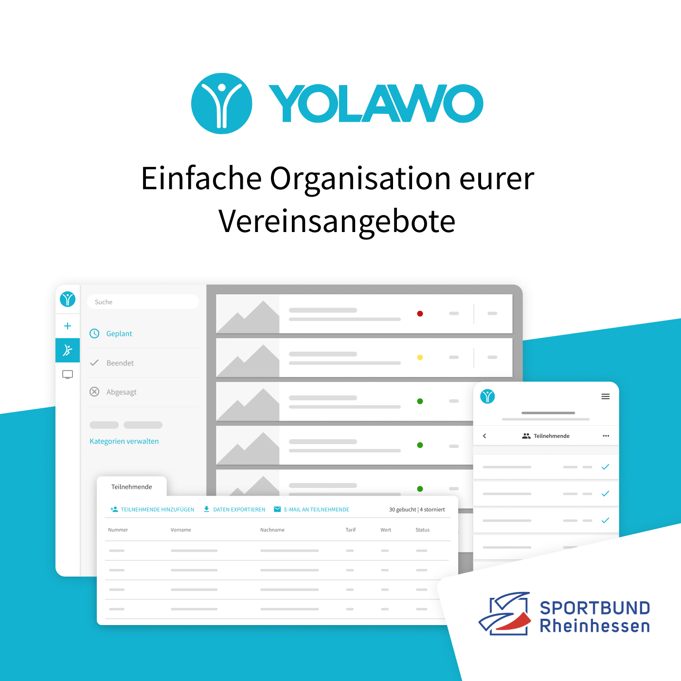 Der neue Kooperationspartner des Sportbundes, das Buchungssystem Yolawo, schafft für Sportvereine die Möglichkeit, Kurse, Camps und andere Events über ihr Online-Buchungssystem einfach abzubilden und das Management der Teilnehmer*innen auf ein neues Level zu bringen. Yolawo bietet nicht nur die Option der Anlegung von individuellen Events und Angeboten, sondern auch die direkte Verwaltung der Anmeldungen und Kostenabwicklung. Vereine können eigene Kategorien für ihre Angebote einstellen – so müssen beispielsweise Allergien oder Notfallnummern für Kindercamps nicht mehr per Zettel abgefragt werden, sondern können direkt bei der digitalen Anmeldung mit angegeben werden.