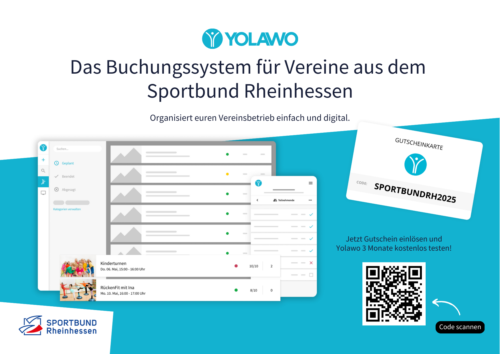 28. Februar 2025Yolawo ist ein innovatives Buchungssystem, das Sportvereinen hilft, ihre Angebote effizient zu verwalten. Mitgliedsvereine des Sportbund Rheinhessen erhalten einen Gutscheincode (SPORTBUNDRH2025), mit dem das Yolawo-System im 1. Lizenzjahr zu 25% rabattiert genutzt werden kann. Im 2. Lizenzjahr und im 3. Lizenzjahr erhalten Mitgliedsvereinen einen exklusiven Rabatt von 10% bzw. 5%. Gutscheine können auf einer eigens erstellten Landingpage eingelöst werden.