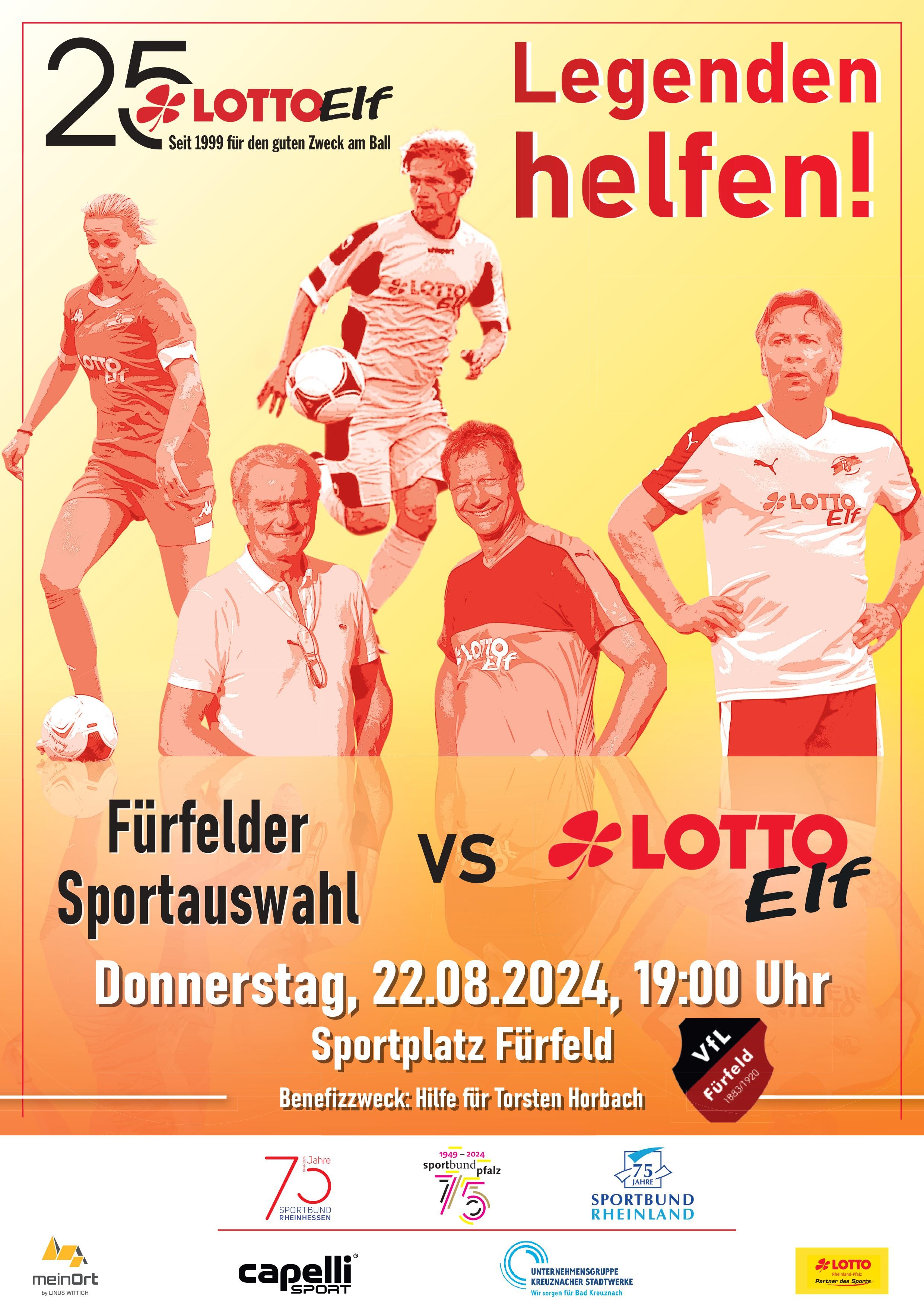Anlässlich ihrer 75-jährigen Jubiläen haben die Sportbünde Rheinland, Pfalz und Rheinhessen mit Unterstützung des Südwestdeutschen Fußballverbandes und des Fußballverbandes Rheinland ein Fußballspiel gegen die rheinland-pfälzische Lotto-Elf ausgeschrieben. Alle Fußballvereine aus Rheinland-Pfalz hatten die Möglichkeit, sich für das Spiel gegen die mit vielen prominenten Gesichtern besetzte Truppe zu bewerben – die einzigen Bedingungen waren ein Rasenplatz und ein guter Zweck. Über 60 Bewerbungen sind eingegangen, die Wahl ist nach sorgfältiger Prüfung auf den VfL Fürfeld gefallen, welcher das Spiel am 22. August austragen wird. Der Verein aus der Nähe von Bad Kreuznach hat sich in seiner Bewerbung für den an Multipler Sklerose (MS) erkrankten Fußball Abteilungsleiter Torsten Horbach stark gemacht.